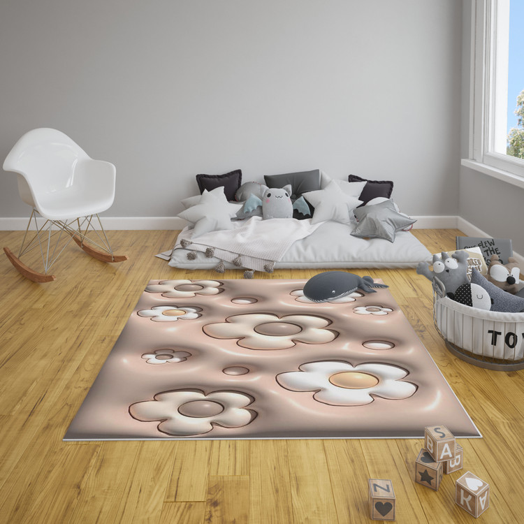 فرش کودک گلهای ساده با طراحی گلهای بزرگ و رنگهای ملایم، فضای اتاق کودک را به شکلی زیبا و آرامشبخش تزیین میکند.