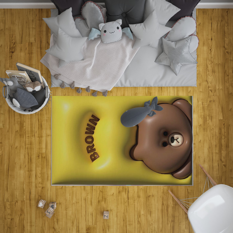 فرش کودک خرس قهوهای با طرحی ساده و شخصیت کارتونی جذاب، فضایی گرم و دلپذیر برای کودکان ایجاد میکند.