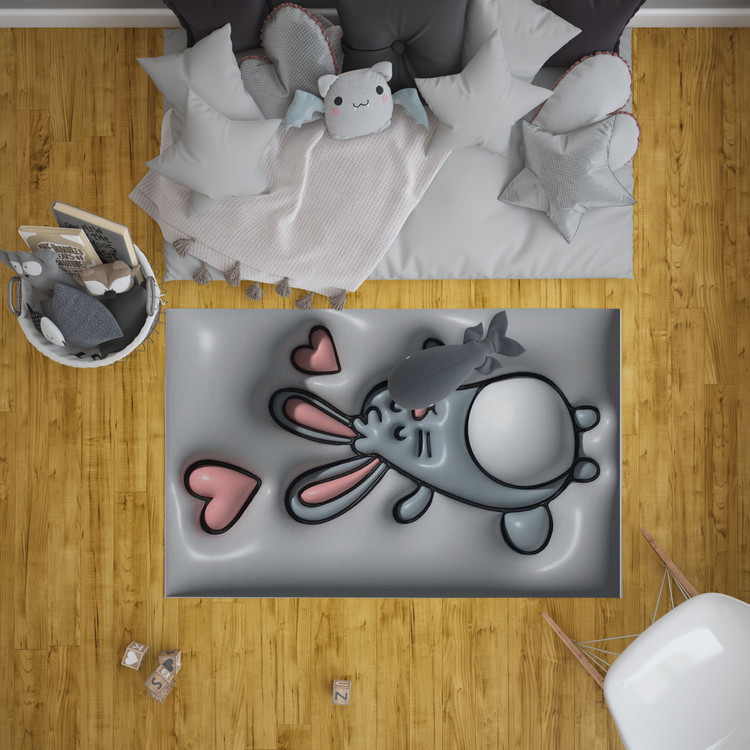 فرش کودک خرگوش عاشق با طرح خرگوشی کارتونی و قلبهای عاشقانه، فضایی دوستداشتنی و رمانتیک برای اتاق کودک فراهم میکند.