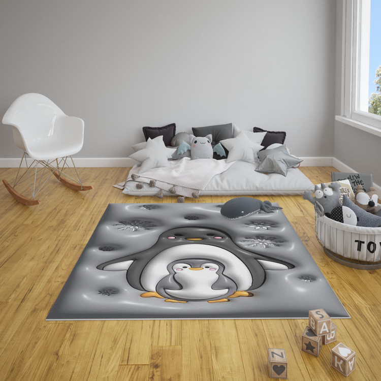 فرش کودک پنگوئنهای دوستداشتنی با طرح زیبای پنگوئن و رنگهای سرد، فضایی آرام و زمستانی را برای اتاق کودک ایجاد میکند.