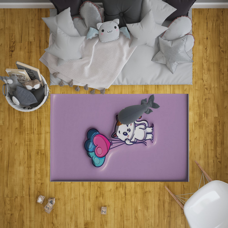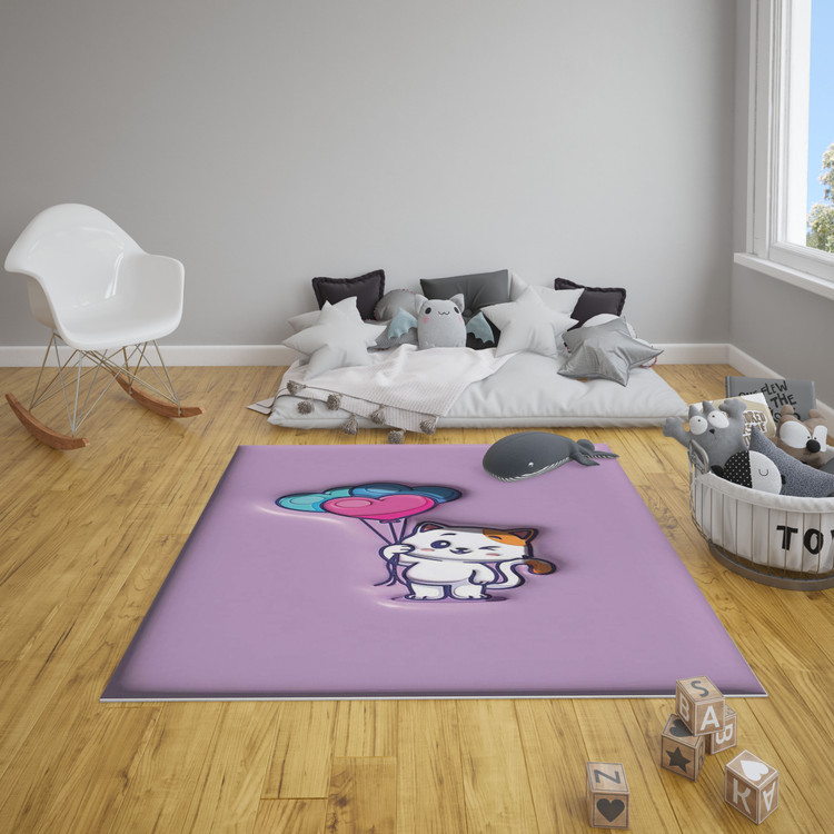 فرش کودک گربه با بادکنکهای قلبی و رنگهای شاد و فانتزی، انتخابی عالی برای تزئین اتاق کودک شما خواهد بود.