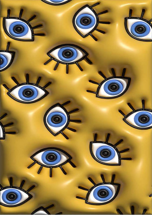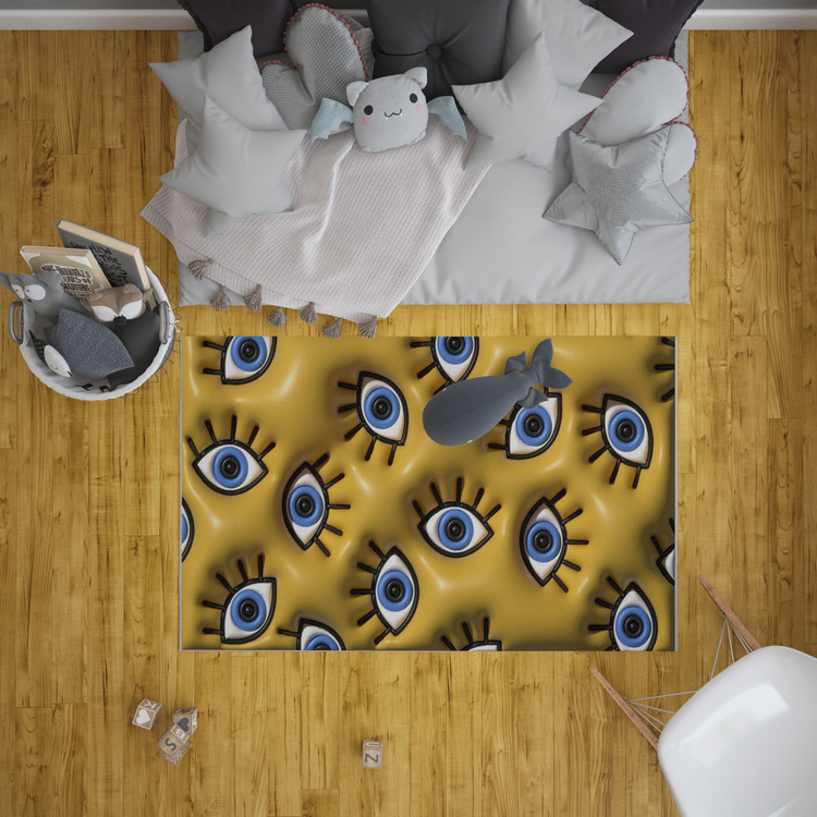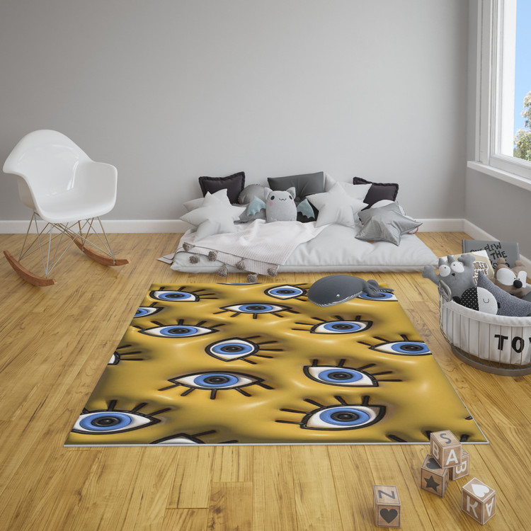 فرش کودک چشمهای طلایی با طراحی جذاب از چشمها بر زمینهای طلایی، فضایی منحصر به فرد و هنری را برای اتاق کودک فراهم میکند.