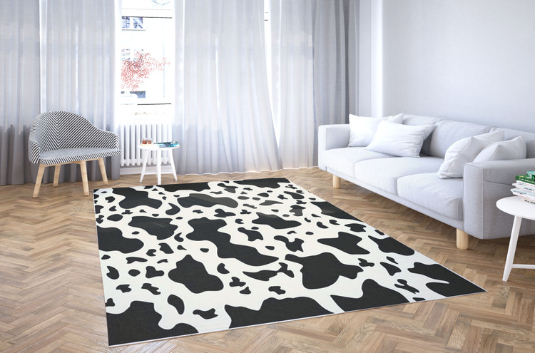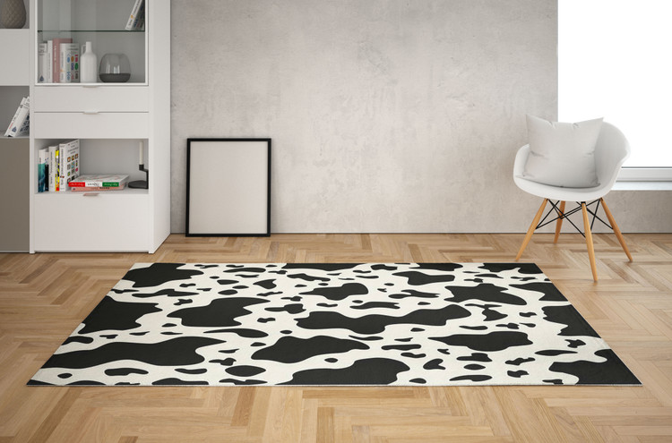 فرش چرم سفید و سیاه کد Z009 با طرح پوست گاوی، زیبایی طبیعی و سادهای را به دکوراسیون اضافه میکند و برای فضاهای مدرن و روستیک مناسب است.