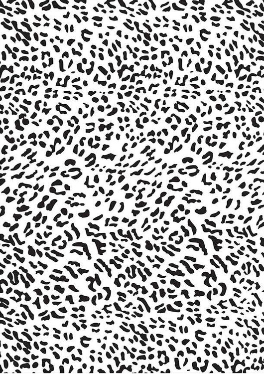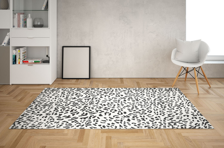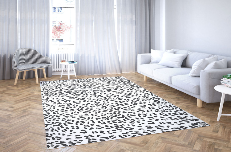 فرش خالدار سفید کد Z022 با الگوی پوست حیوانات و رنگ سفید و مشکی، انتخابی ساده و شیک برای دکوراسیونهای مدرن است.