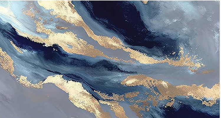 فرش راهرویی با طرح آبستره و رنگهای آبی و طلایی، مناسب برای دکوراسیونهای هنری و مدرن.