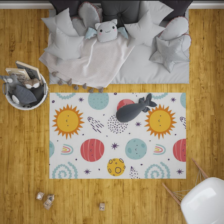 فرشینه مخمل ضد حساسیت اتاق کودک طرح منظومه شمسی مینیمال کد c 176 - فرش چاپی اتاق کودک