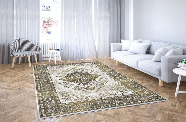 با الگوهای متقارن و رنگهای سبز و طلایی، این فرش برای فضاهای رسمی و تشریفاتی مناسب است و حس ثروت و قدرت را منتقل میکند.