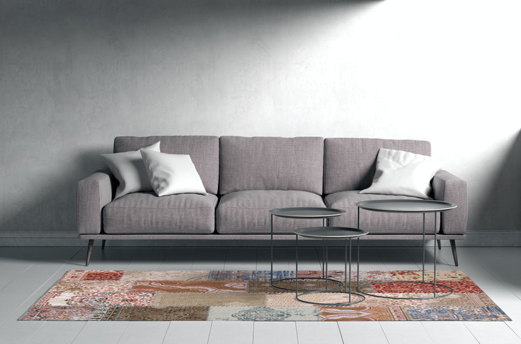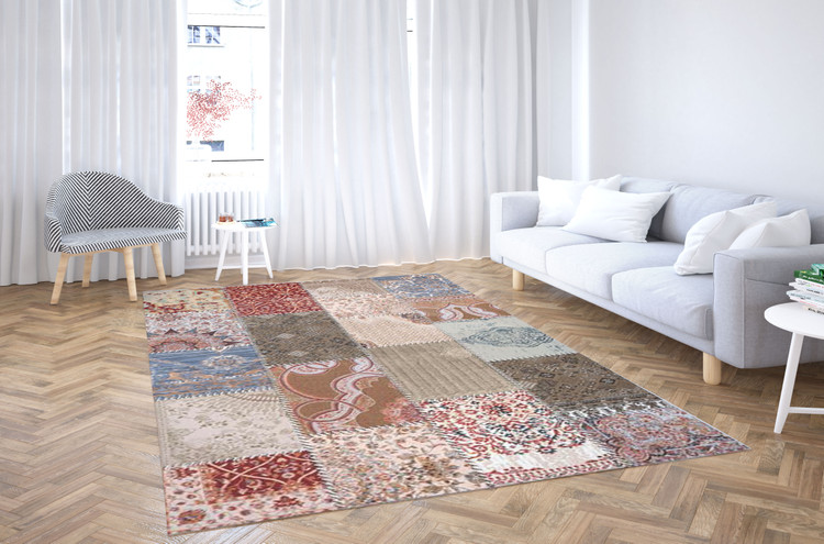 فرش نقشبندی وصلهای با ترکیب قطعات مختلف از نقوش سنتی، حسی از نوآوری و خلاقیت را به فضا میآورد. این فرش با ترکیب رنگها و الگوهای متنوع، مناسب برای دکوراسیونهای خاص و هنری است.