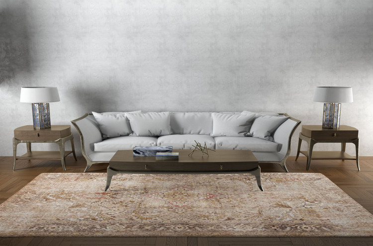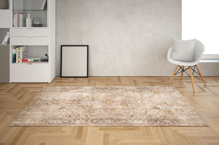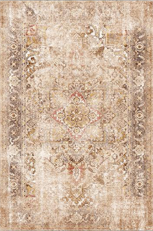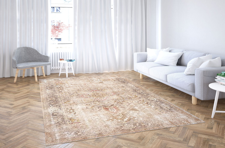 فرش افق شنزار کد M212 با رنگهای خاکی و طراحی کهنهنما، فضایی آرام و دلپذیر به محیط شما میبخشد و برای دکوراسیونهای مینیمال و بوهو مناسب است.