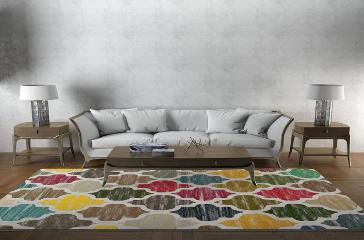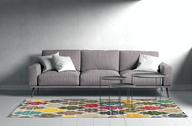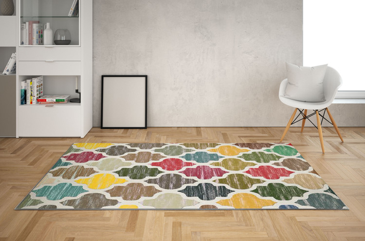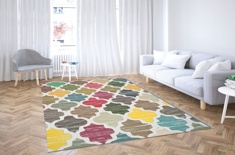 فرش رنگین کمانی مدرن کد M267 با رنگهای شاد و طرحهای هندسی، برای فضاهای مدرن و جوانپسند بسیار مناسب است.