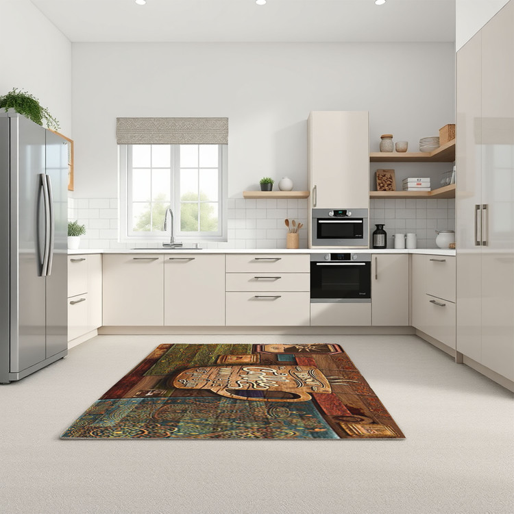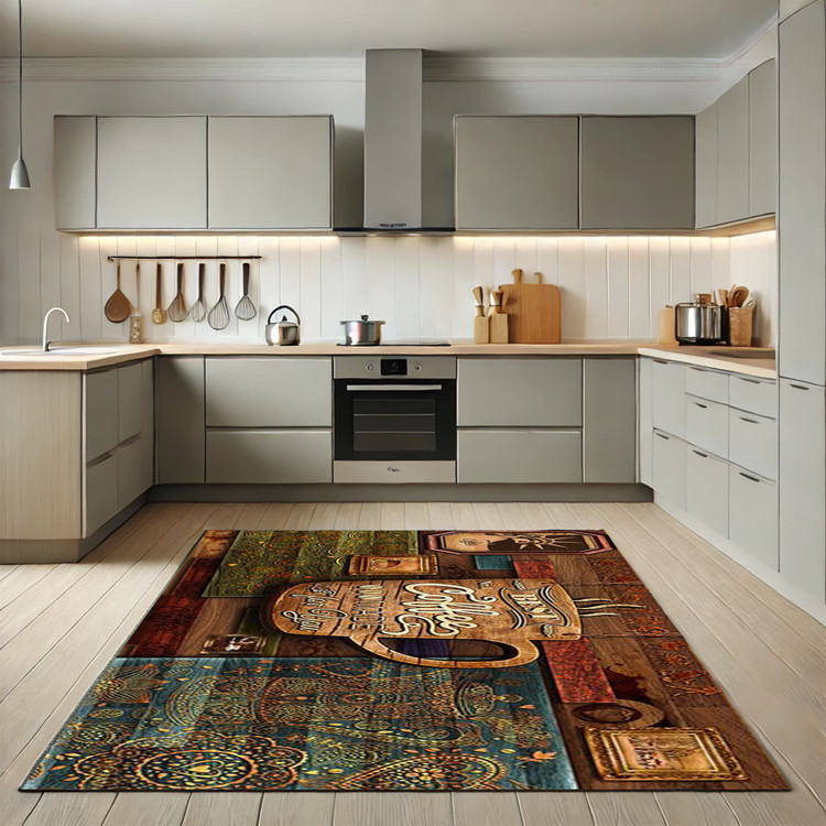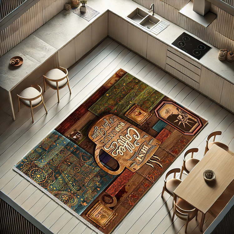 فرش قهوهساز کلاسیک کد K102 با ترکیب رنگهای قهوهای و طراحی کلاسیک قهوهساز، فضایی گرم و نوستالژیک در آشپزخانه خلق میکند.