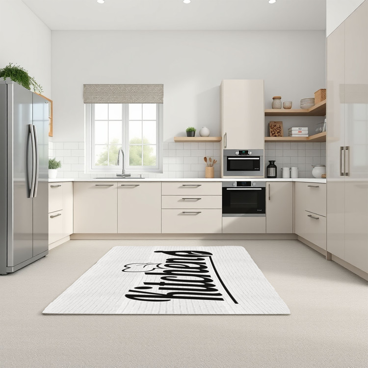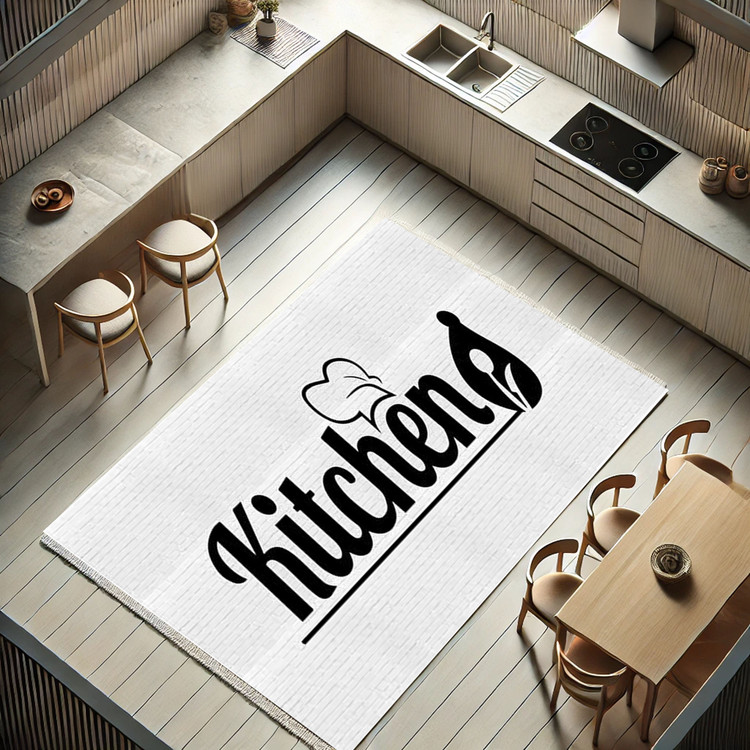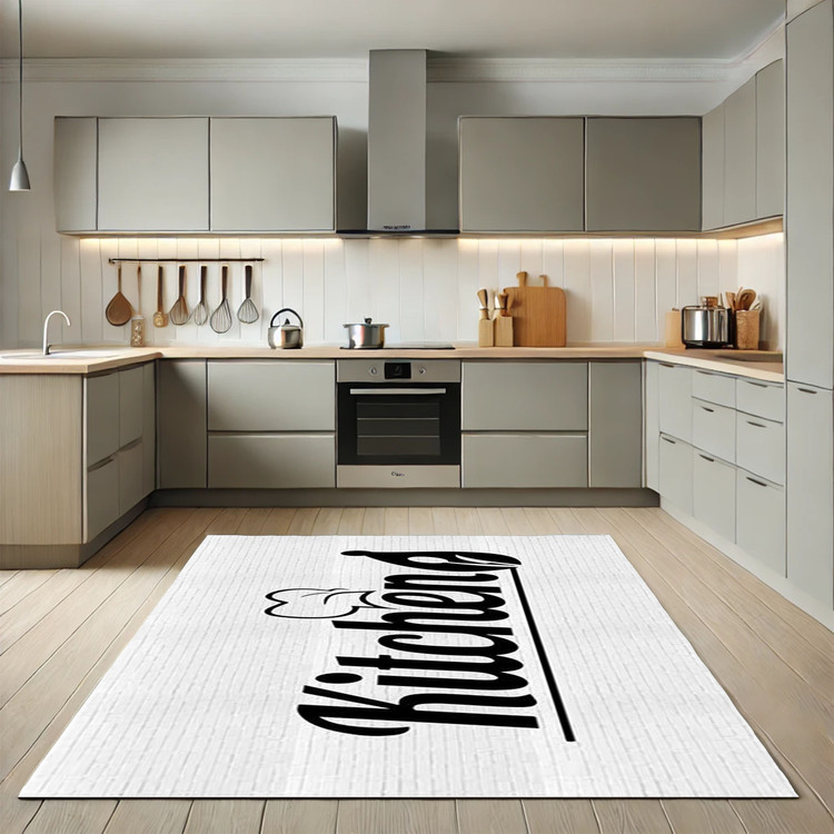 فرش مینیمال آشپزخانه کد K107 با طرح ساده و مینیمالی از واژه "Kitchen"، انتخابی مناسب برای دکوراسیونهای مدرن و ساده است.