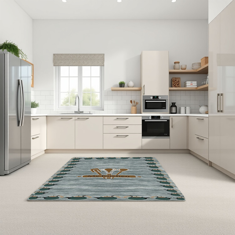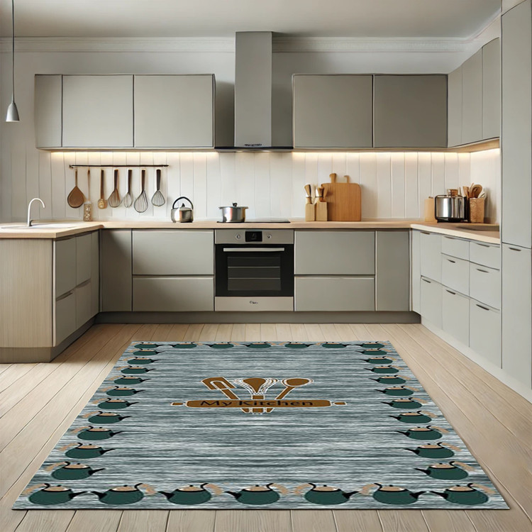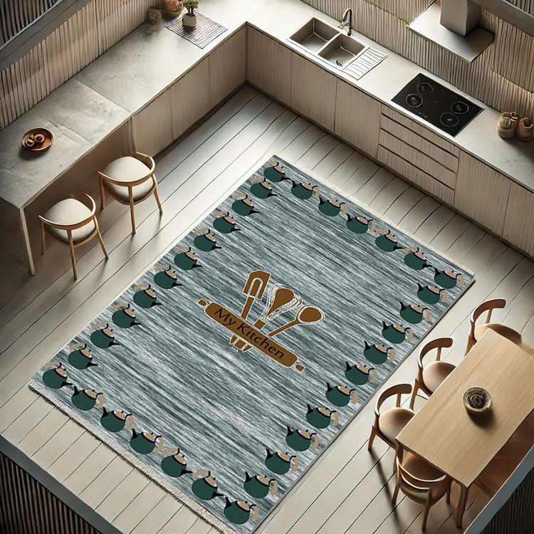 فرش سنتی آشپزخانه کد K109 با طرح فنجانهای چای و قاشقهای آشپزی، حس نوستالژی و گرمای خانواده را به آشپزخانه میآورد.