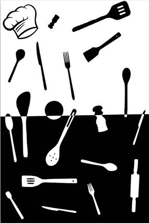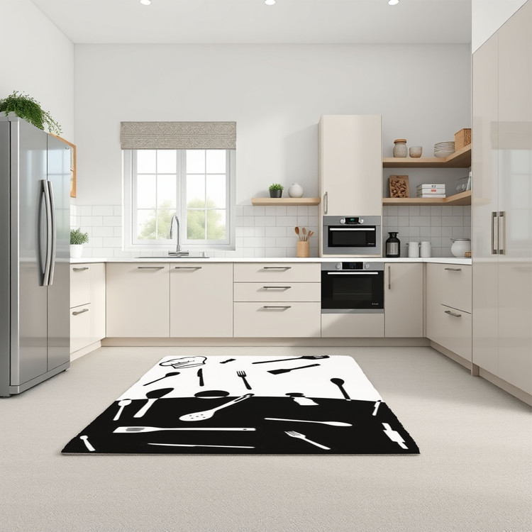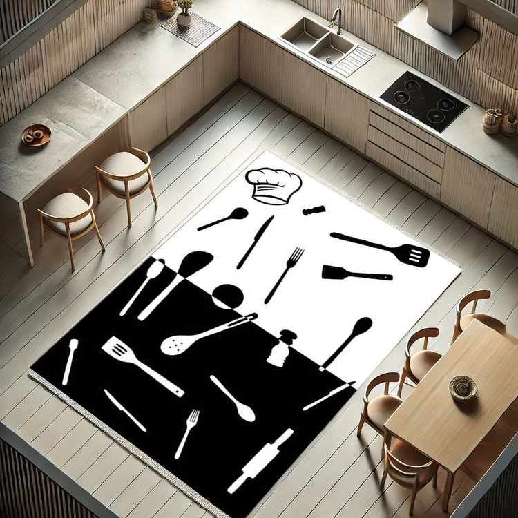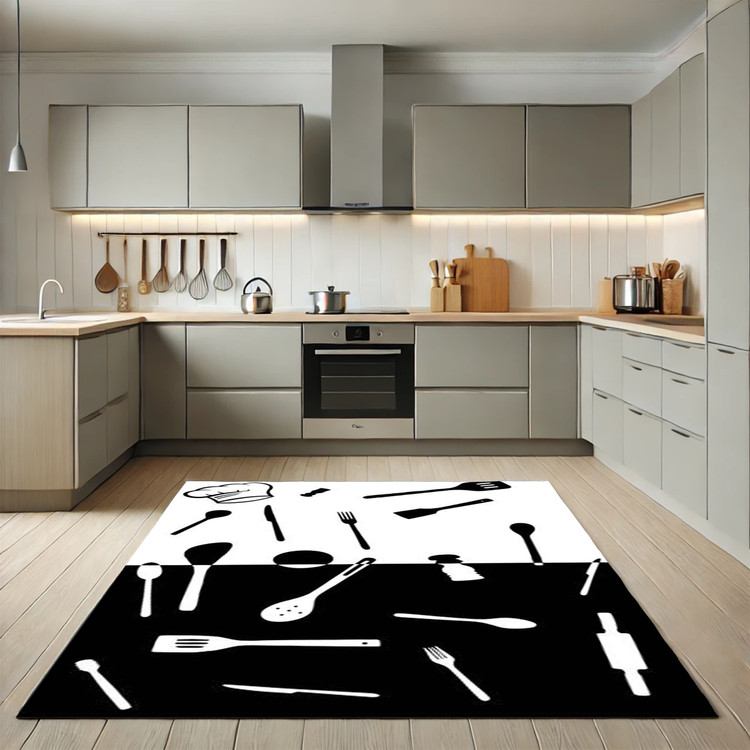 فرش چاپی ابزار آشپزی کد K117 با طراحی ابزارهای آشپزی به صورت سیاه و سفید، فضایی مدرن و مینیمال به آشپزخانه شما اضافه میکند.