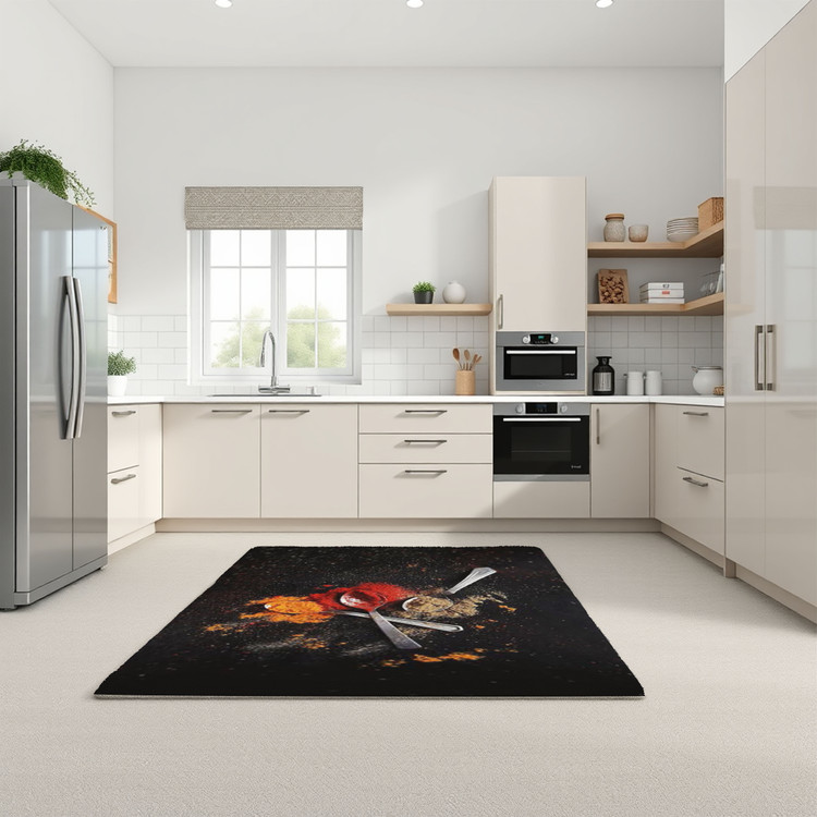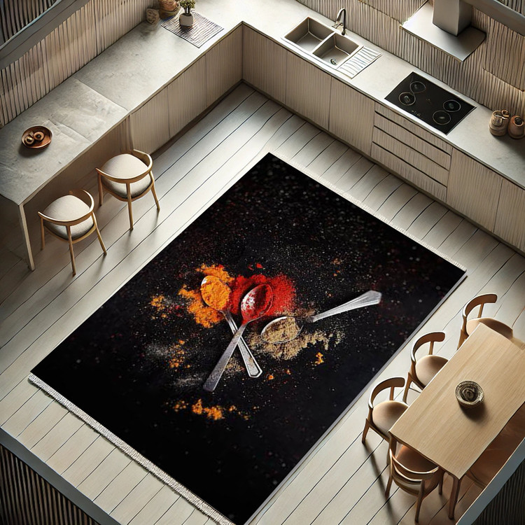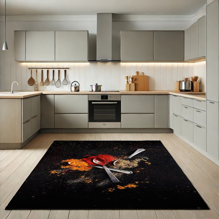 فرش چاپی ادویههای رویایی کد K121 با طراحی خاص از ادویهها روی زمینه تیره، فضایی متفاوت و جذاب به آشپزخانه شما میبخشد.