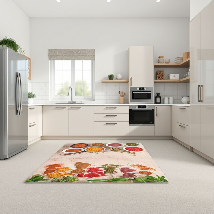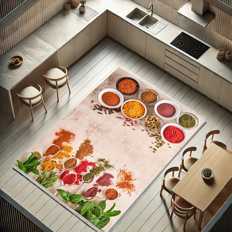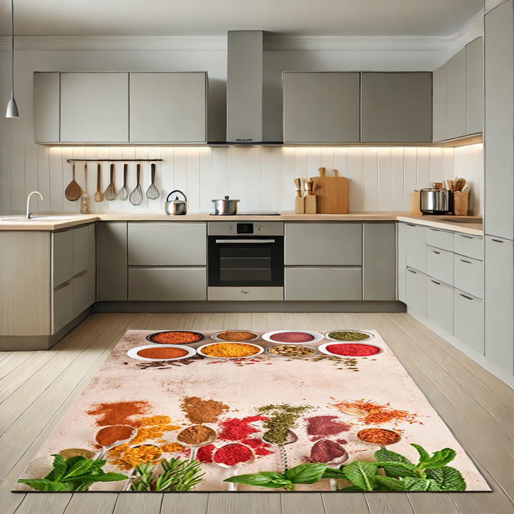 فرش چاپی ادویههای معطر کد K123 با تصویر زیبایی از انواع ادویههای معطر و رنگارنگ، فضایی خوشبو و دلپذیر به آشپزخانه شما میآورد.