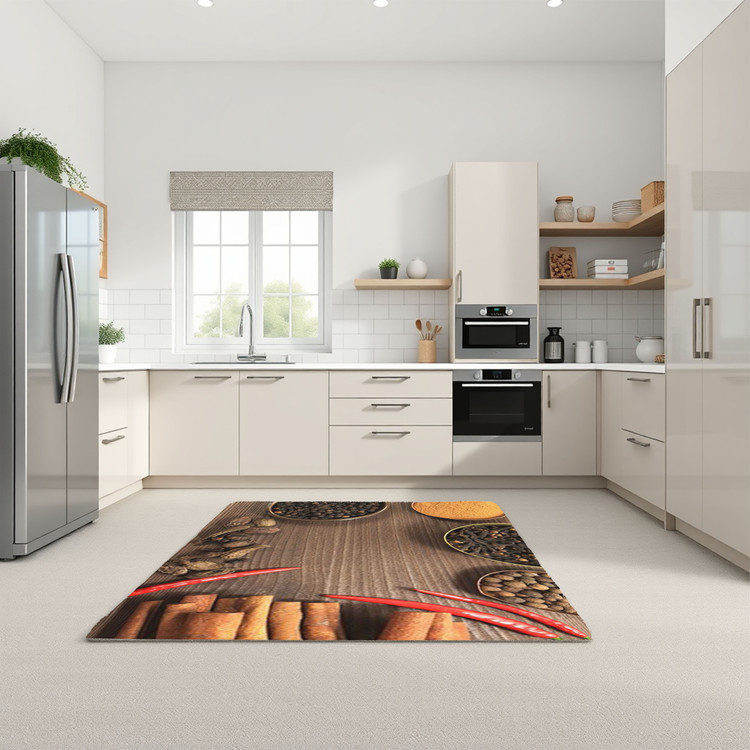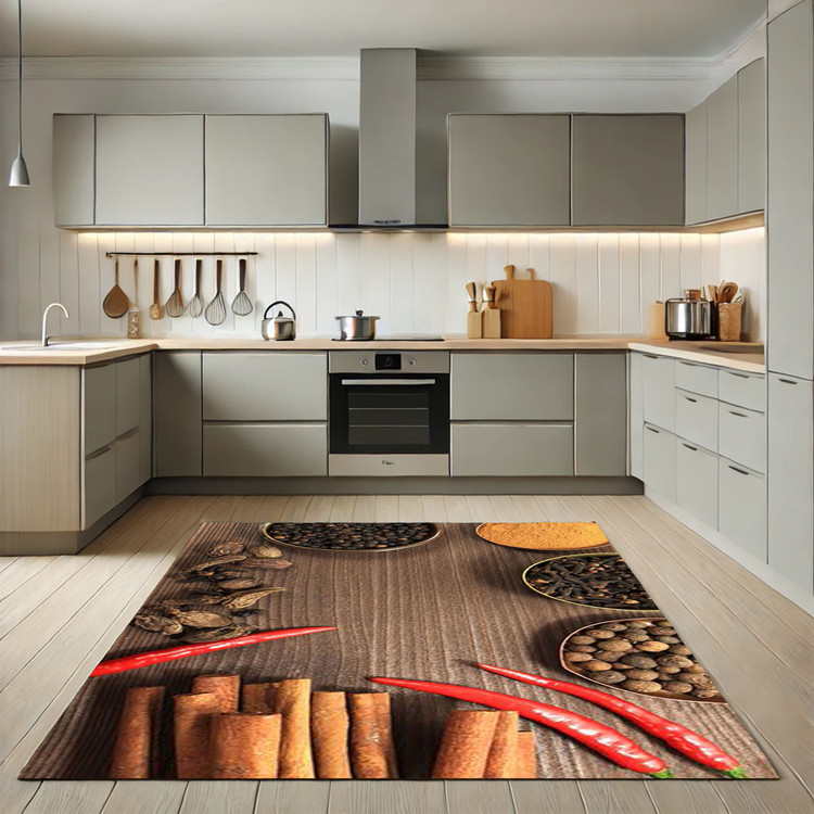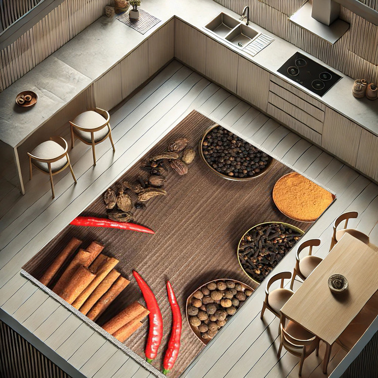 فرش چاپی ادویههای چوبی کد K124 با تصویر انواع ادویههای چوبی مانند دارچین و فلفل، فضایی گرم و سنتی به آشپزخانه شما میآورد.