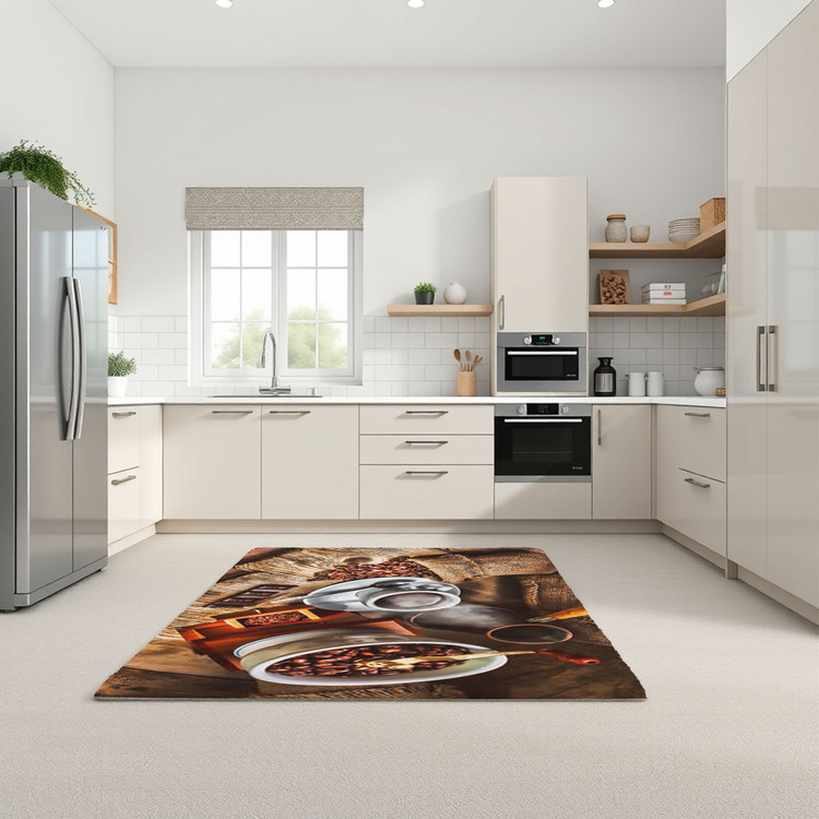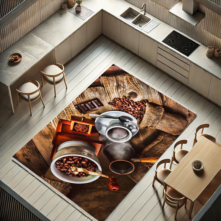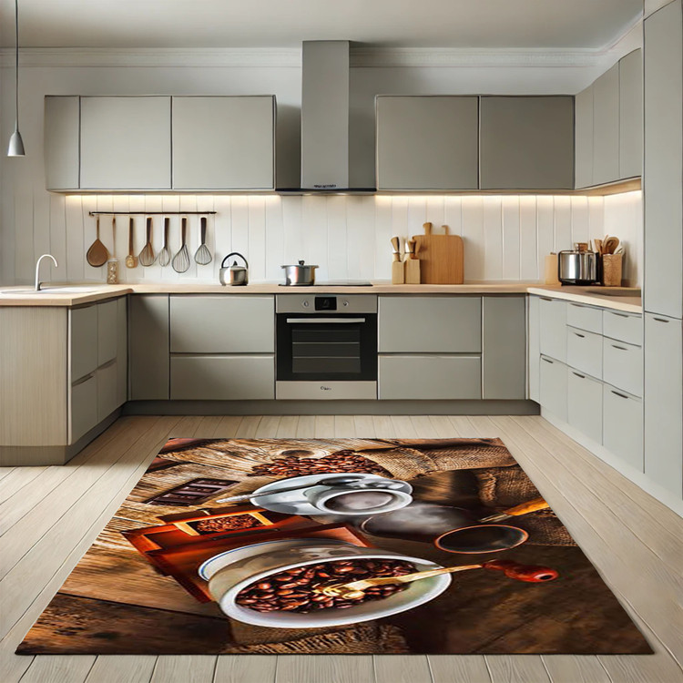 فرش چاپی صبحانه قهوه کد K125 با تصویر آرامبخش فنجان قهوه و وسایل چوبی، حس آرامش و گرمی را به آشپزخانه یا فضای صبحانهخوری شما اضافه میکند.