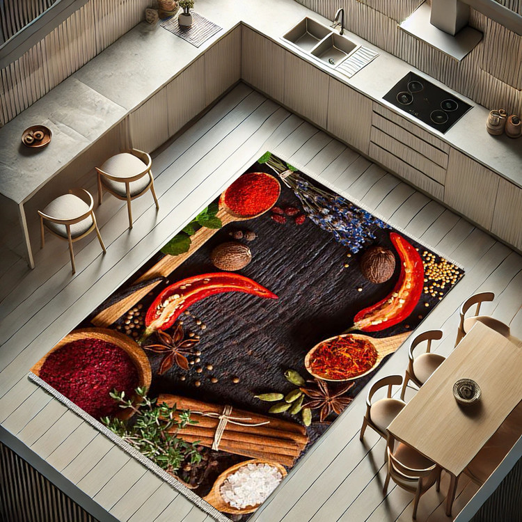 فرش چاشنیها کد K131 با ترکیب رنگهای قوی و ادویههای متنوع، حس طراوت و انرژی را به محیط آشپزخانه و فضای داخلی شما میآورد.