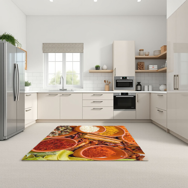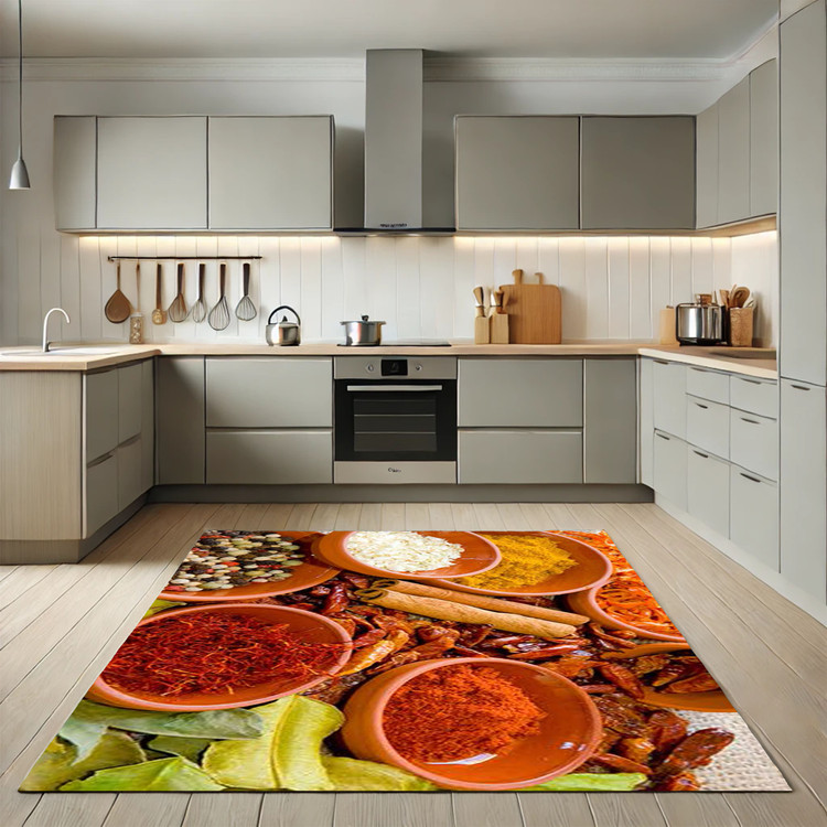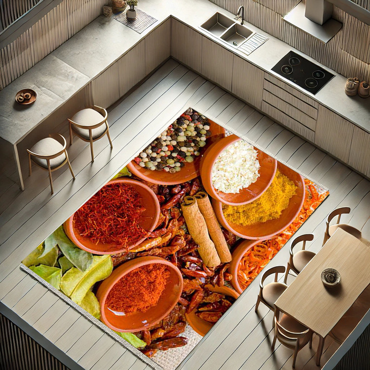 فرش طعمهای رنگین کد K132 با طرح ترکیب ادویهها و گیاهان معطر، جلوهای رنگین و دلنشین به دکوراسیون آشپزخانه شما اضافه میکند.