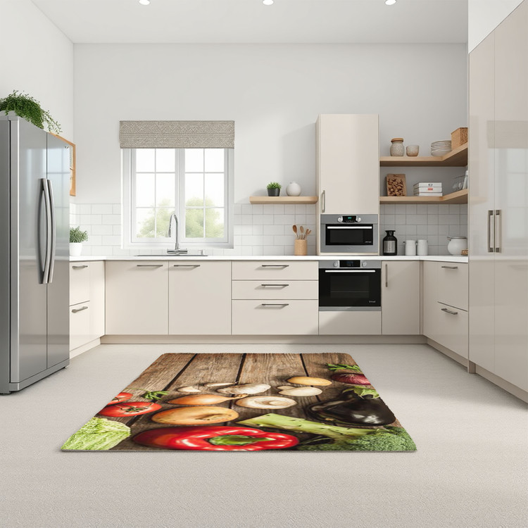 فرش سبزیجات تازه کد K142 با طراحی زیبا از انواع سبزیجات تازه مانند گوجهفرنگی، فلفل و قارچ، حس تازگی و طراوت را به آشپزخانه شما میآورد.