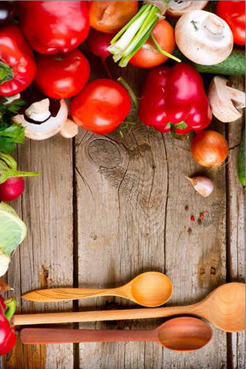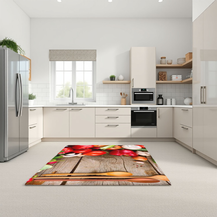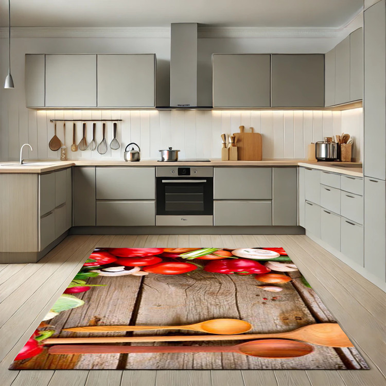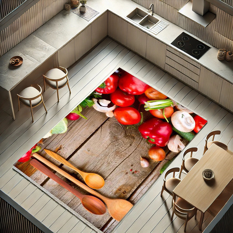 فرش چوب و چاشنی کد K143 با ترکیب میوهها و سبزیجات تازه و قاشقهای چوبی، حس طبیعی و ارگانیک به آشپزخانه شما میبخشد.