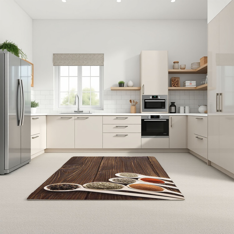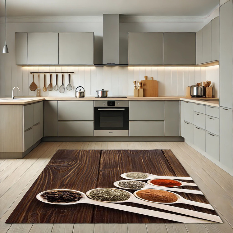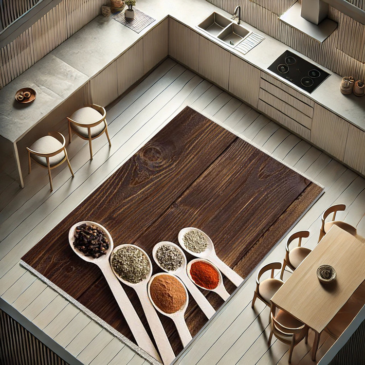 فرش ادویهبار سنتی کد K148 با الهام از چیدمان زیبای ادویهها و رنگهای گرم، حس و حال گرم و دلنشینی به آشپزخانه و فضاهای کوچک اضافه میکند.