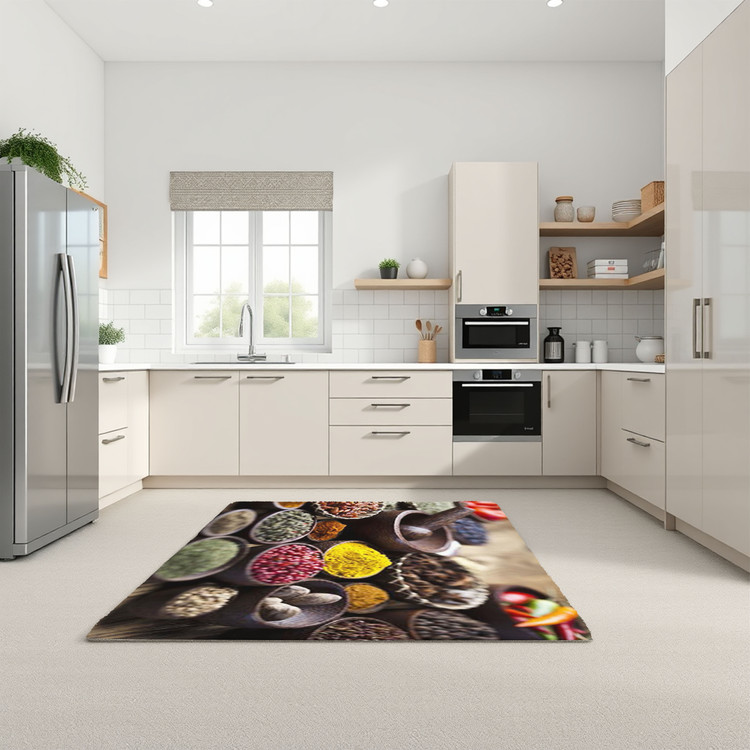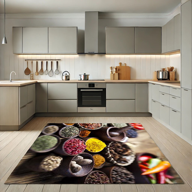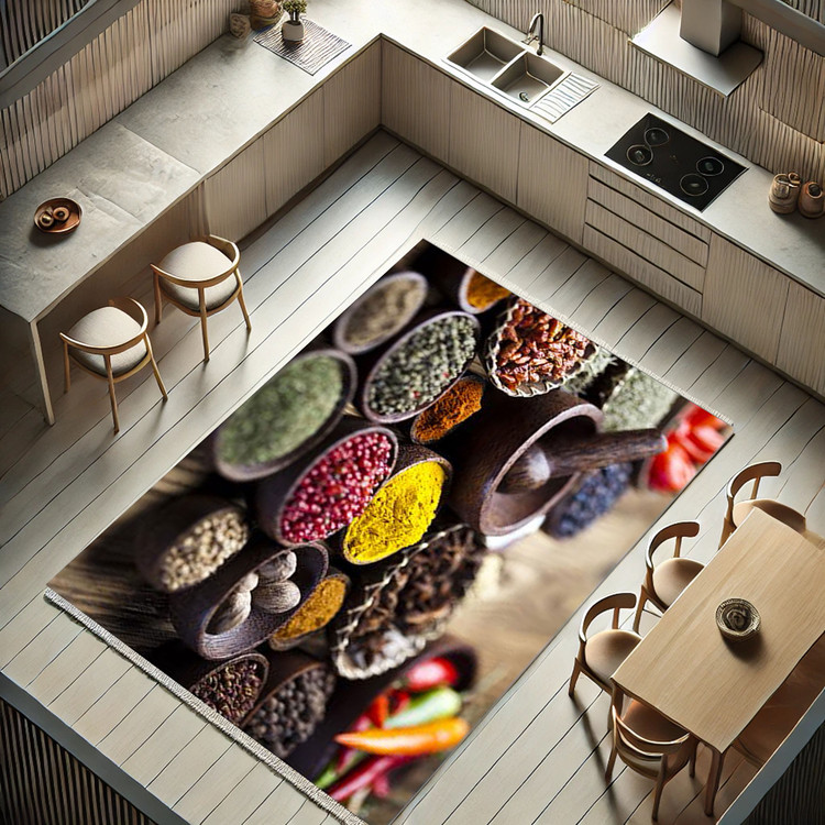 فرش ظرفهای ادویهدار کد K153 با طراحی مدرن از ظرفهای پر از ادویههای رنگارنگ، جلوهای تازه و جذاب به آشپزخانه شما میبخشد.