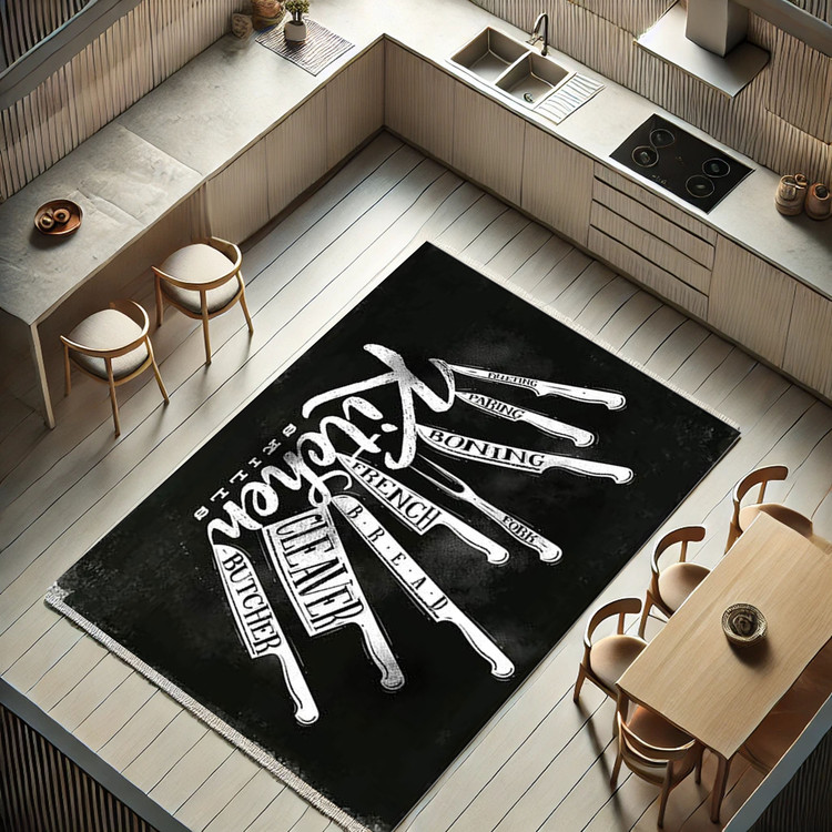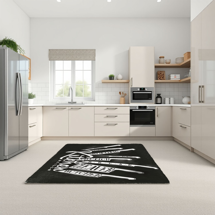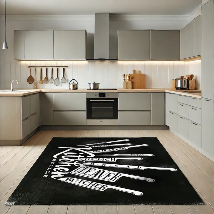 فرش ابزارهای آشپزخانه کد K155 با طراحی گرافیکی از انواع ابزارهای آشپزی، جلوهای مدرن و منحصر به فرد به فضای آشپزخانه شما میبخشد.