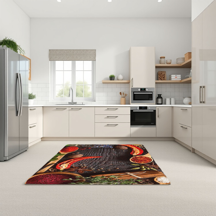 فرش چیدمان فلفل و ادویهها کد K159 با استفاده از رنگهای قرمز و طبیعی، جلوهای گرم و خاص به فضای آشپزخانه شما اضافه میکند.
