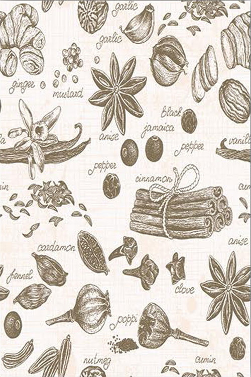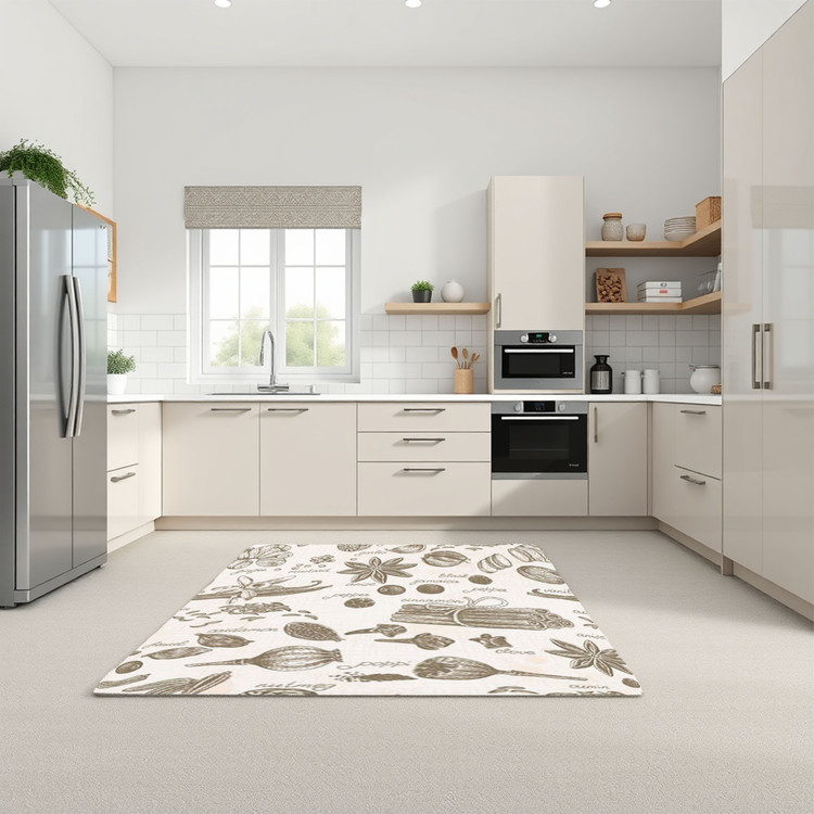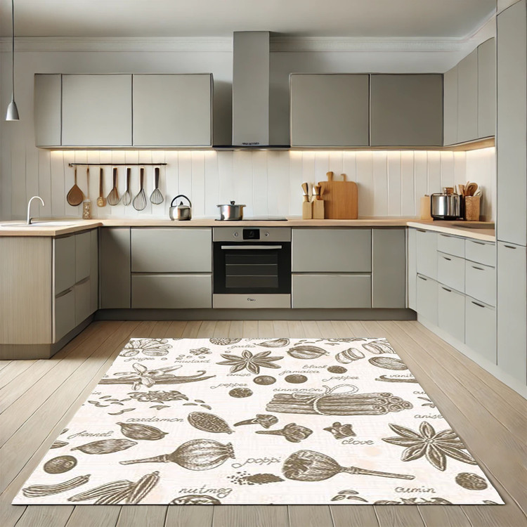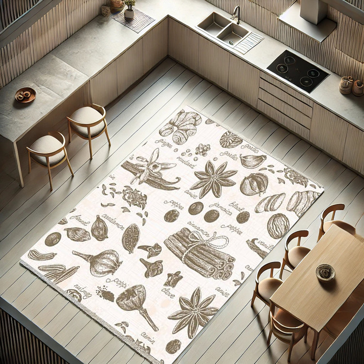 فرش ادویههای اصیل کد K165 با طرحهایی از ادویهها و گیاهان کلاسیک، فضای آشپزخانه را با حس اصالت و طبیعی بودن تکمیل میکند.