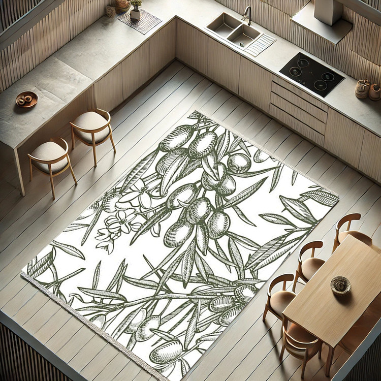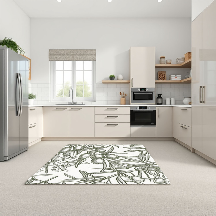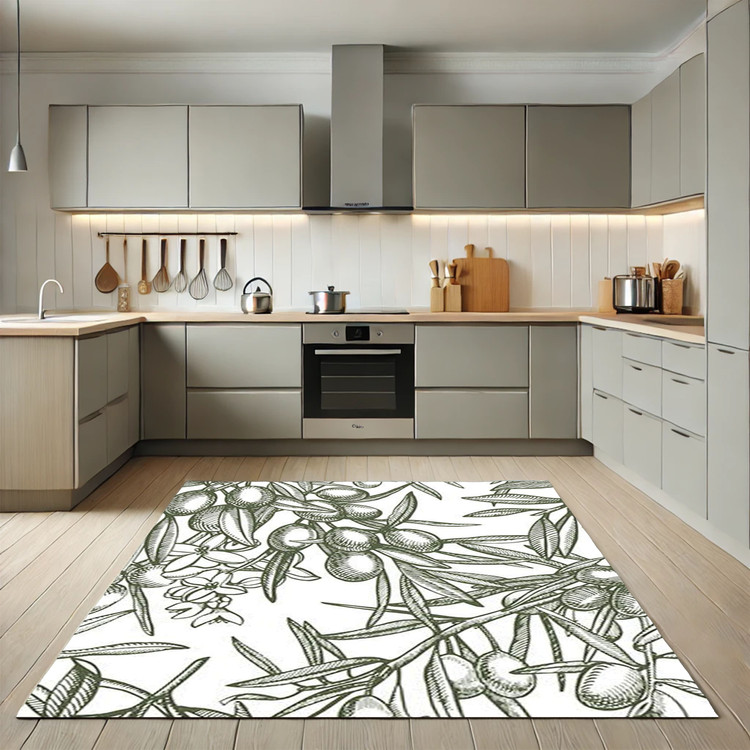 فرش زیتون سبز کد K168 با طرح برگهای زیتون و پسزمینه ساده، حسی از طبیعت و طراوت را به آشپزخانه شما هدیه میدهد.