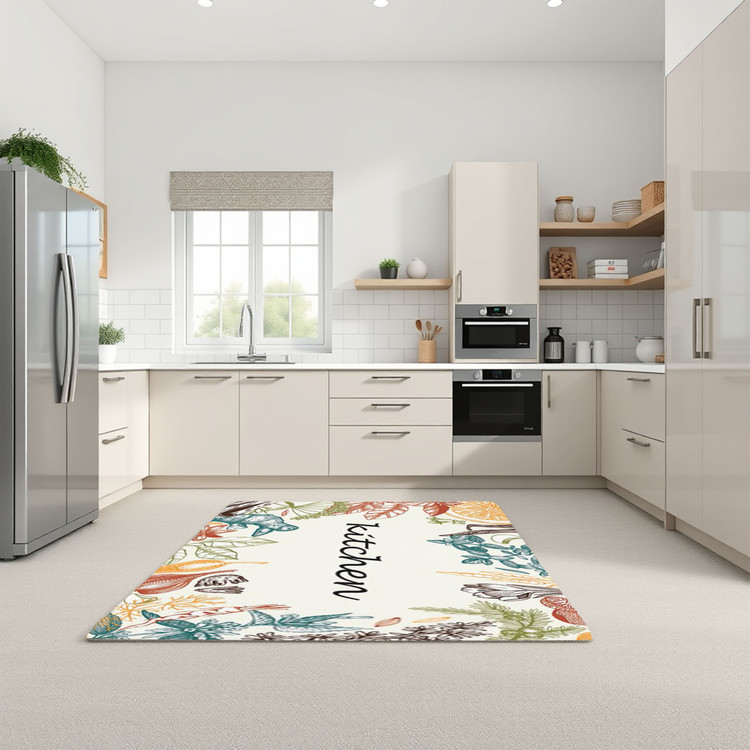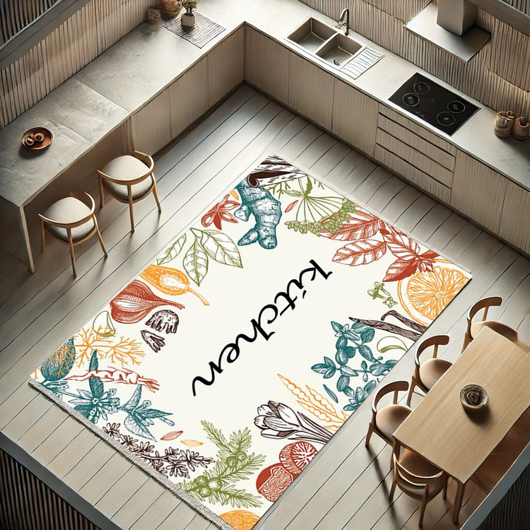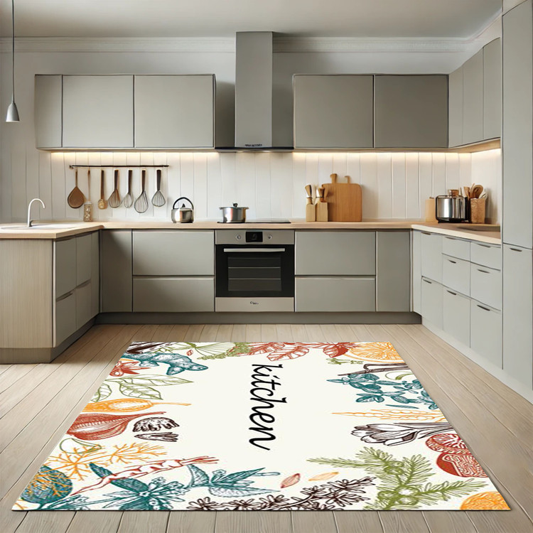 فرش آشپزی رنگارنگ کد K172 با طرحی از سبزیجات و میوههای رنگارنگ و واژه "Kitchen"، جلوهای شاد و زنده به آشپزخانه شما میبخشد.