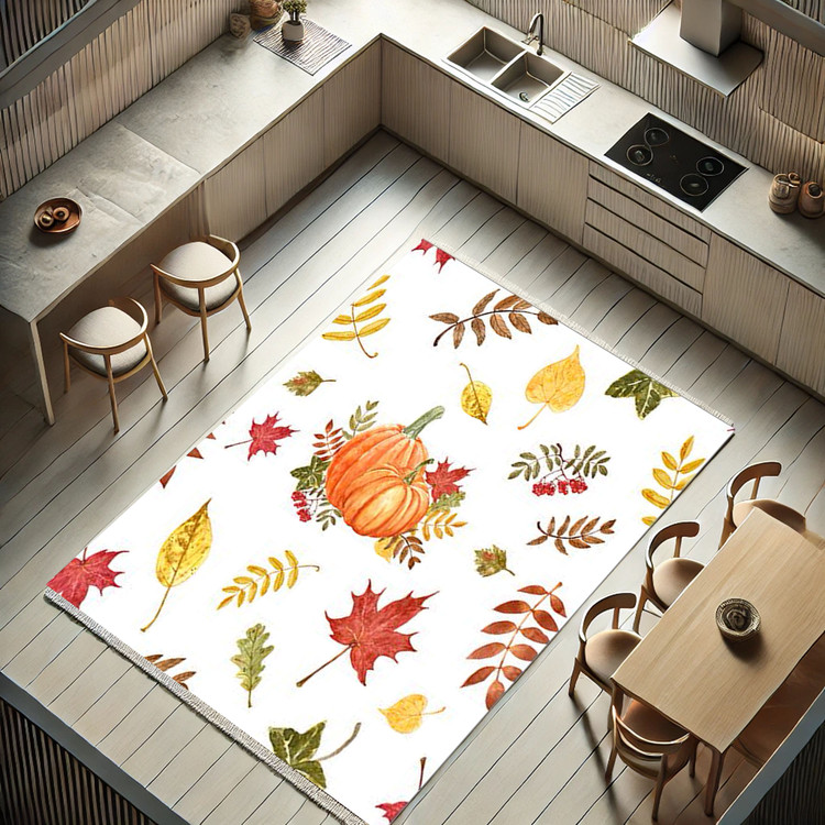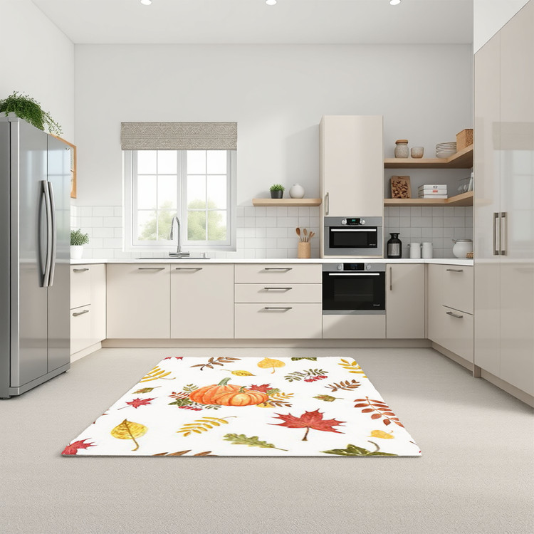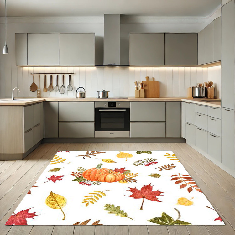 فرش پاییزی کد K174 با طراحی برگهای پاییزی و رنگهای زنده، جلوهای از طبیعت پاییز را به آشپزخانه شما میآورد.