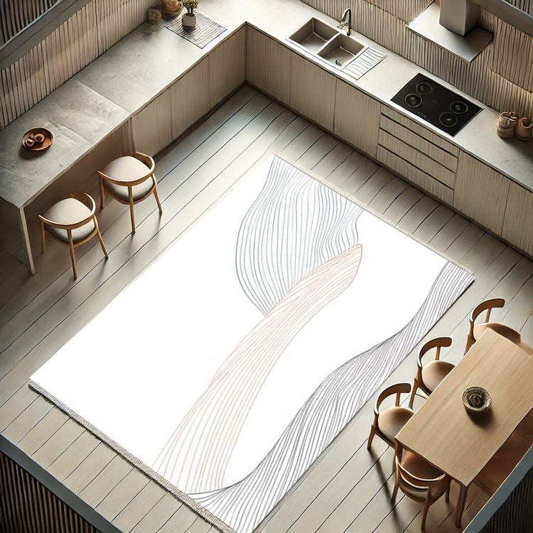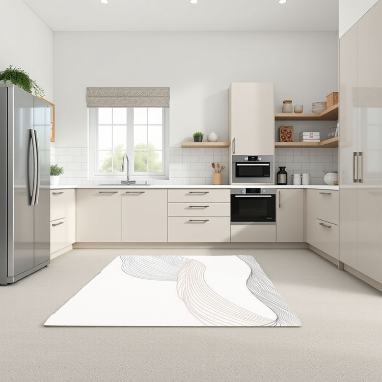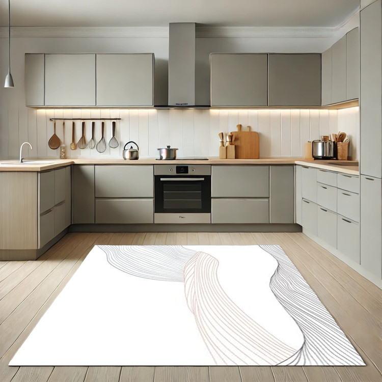 فرش موجهای ساده کد K177 با طراحی خطوط منحنی و رنگهای ملایم، فضایی آرام و زیبا به آشپزخانه شما میبخشد.