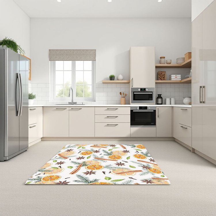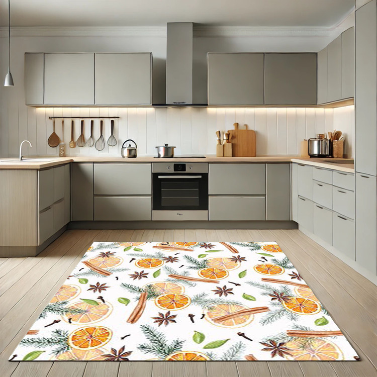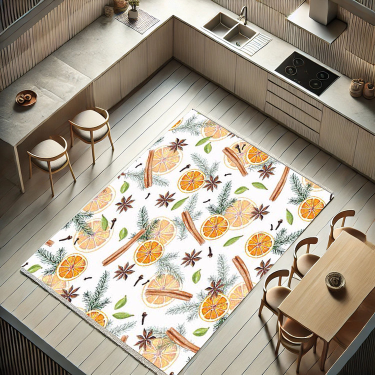 فرش مرکبات و ادویهجات پاییزی کد K181 با ترکیب مرکبات و ادویهجات پاییزی، محیط آشپزخانه را گرم و زیبا میکند.
