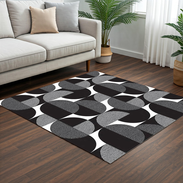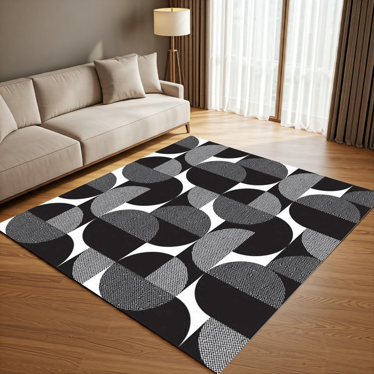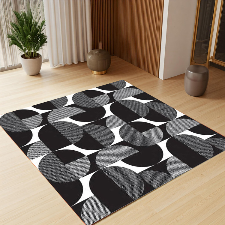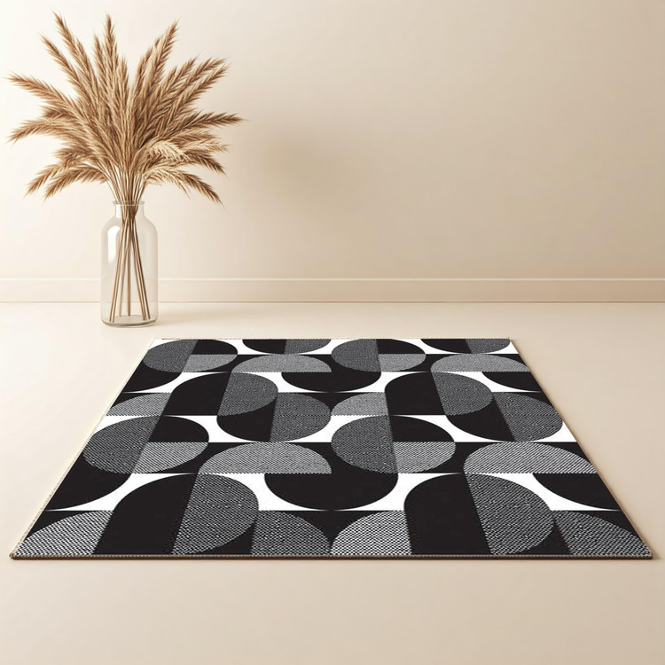 فرش هندسی سیاه و سفید کد Q101 با طراحی مدرن و مینیمال، فضایی مدرن و شیک به دکوراسیون شما میبخشد و مناسب برای فضاهای مینیمالیستی است.