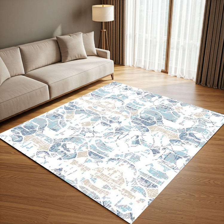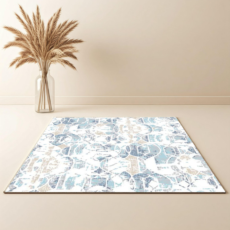 فرش آبی پرنیان کد Q134 با رنگهای آبی آرامشبخش و الگوهای مدرن، انتخابی مناسب برای دکوراسیونهای مدرن و مینیمال است و حس تازگی به فضا میبخشد.