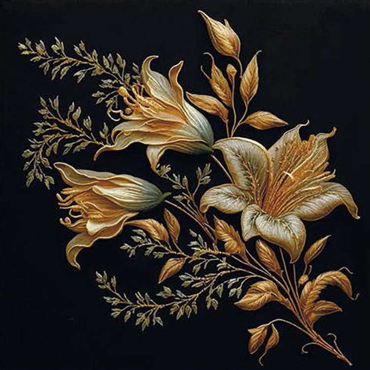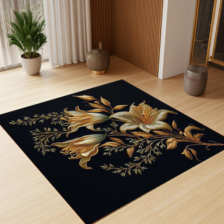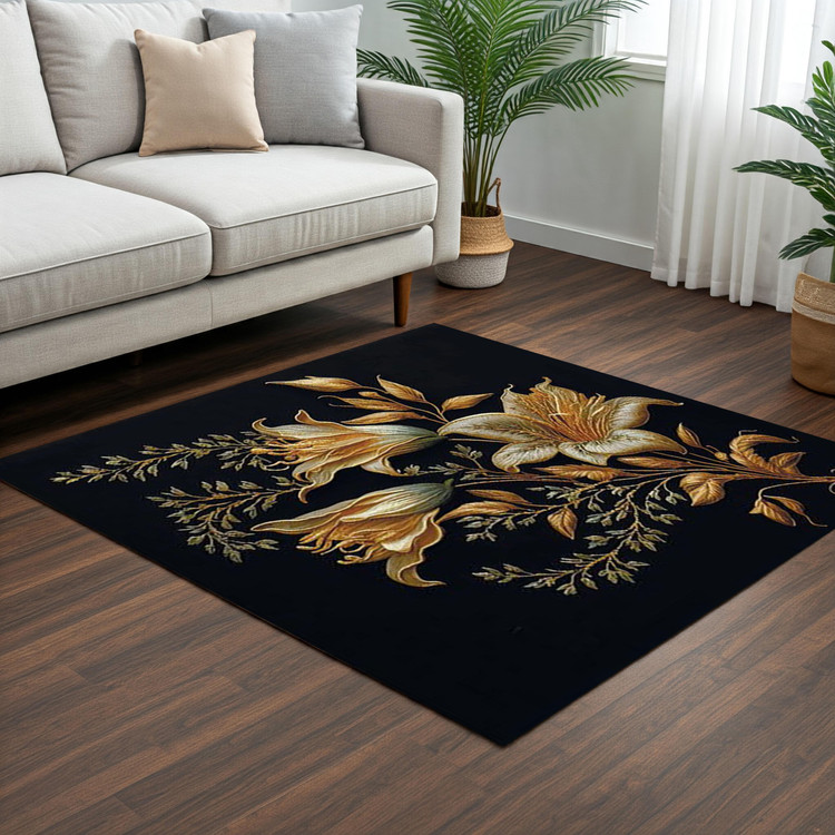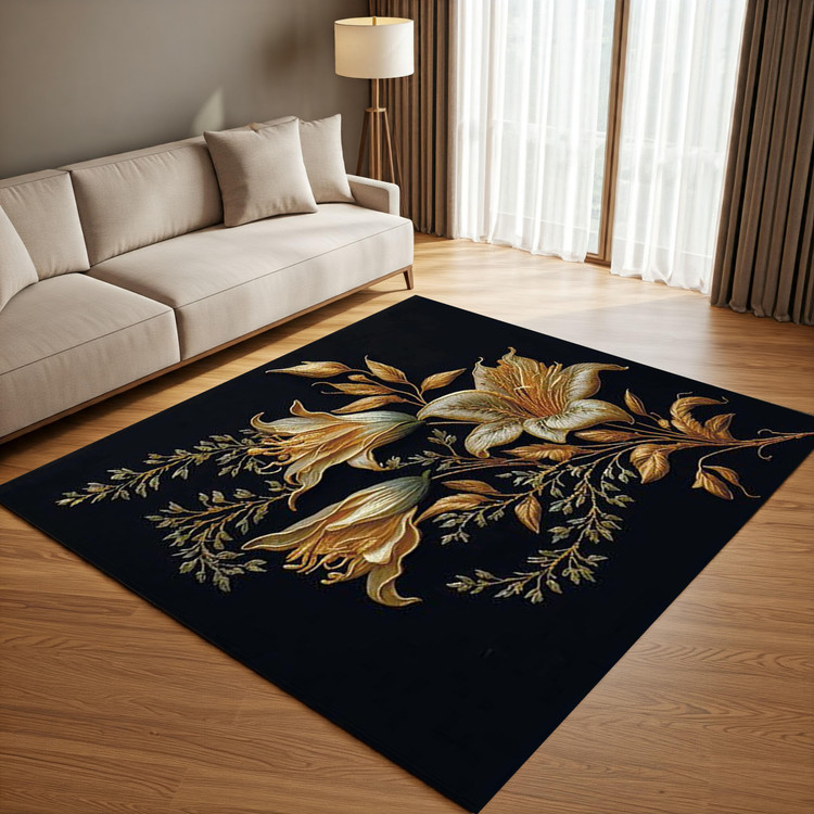 فرش زنبق طلایی کد Q136 با طرح گلهای زنبق طلایی و رنگهای شیک، انتخابی مناسب برای دکوراسیونهای لوکس و خاص است و فضایی زیبا و دلنشین ایجاد میکند.