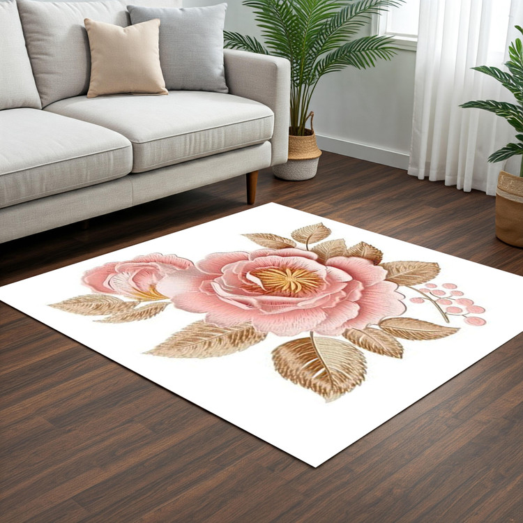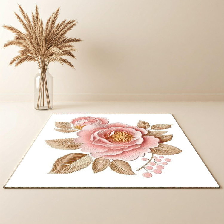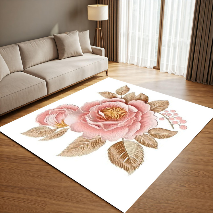 فرش شکوفه بهاری کد Q138 با گلهای صورتی و برگهای لطیف طلایی، انتخابی ایدهآل برای اتاق نشیمن یا اتاق خواب است که حسی از بهار و شادابی را به فضای شما میآورد.