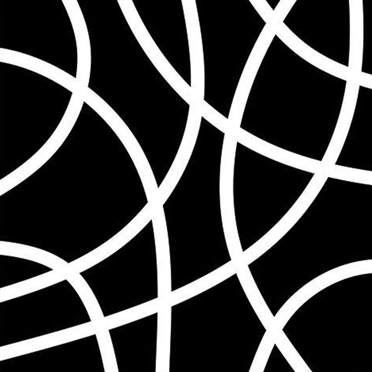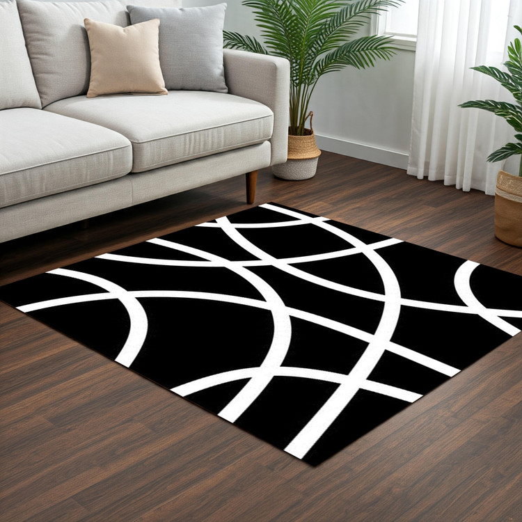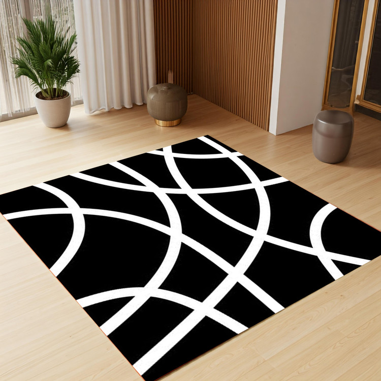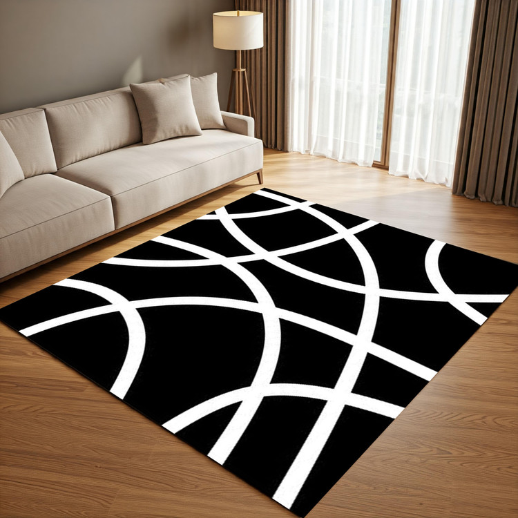 فرش سیاهسپید مدرن کد Q139 با طراحی مینیمال و خطوط منحنی سفید روی زمینه مشکی، مناسب دکوراسیونهای مدرن و مینیمالیستی است و جلوهای خاص و زیبا به فضا میبخشد.