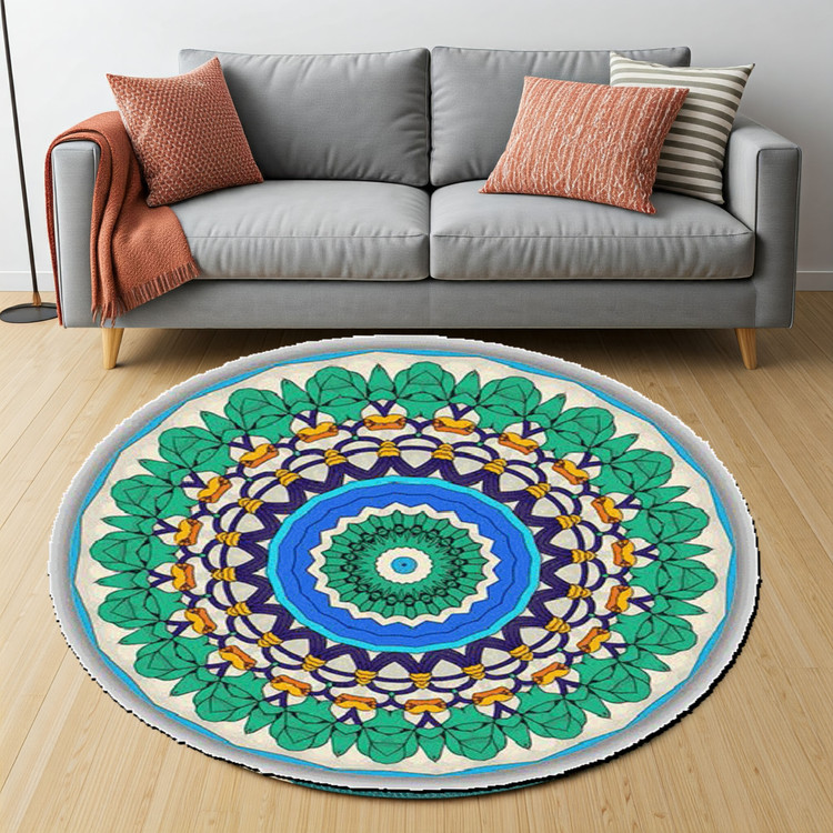 فرش دایرهای سبزینهگل کد D133 با ترکیب رنگهای سبز و آبی و طرحهای گلدار، فضایی دلنشین و پر از طراوت به خانه شما اضافه میکند و مناسب فضاهای طبیعی و آرامشبخش است.