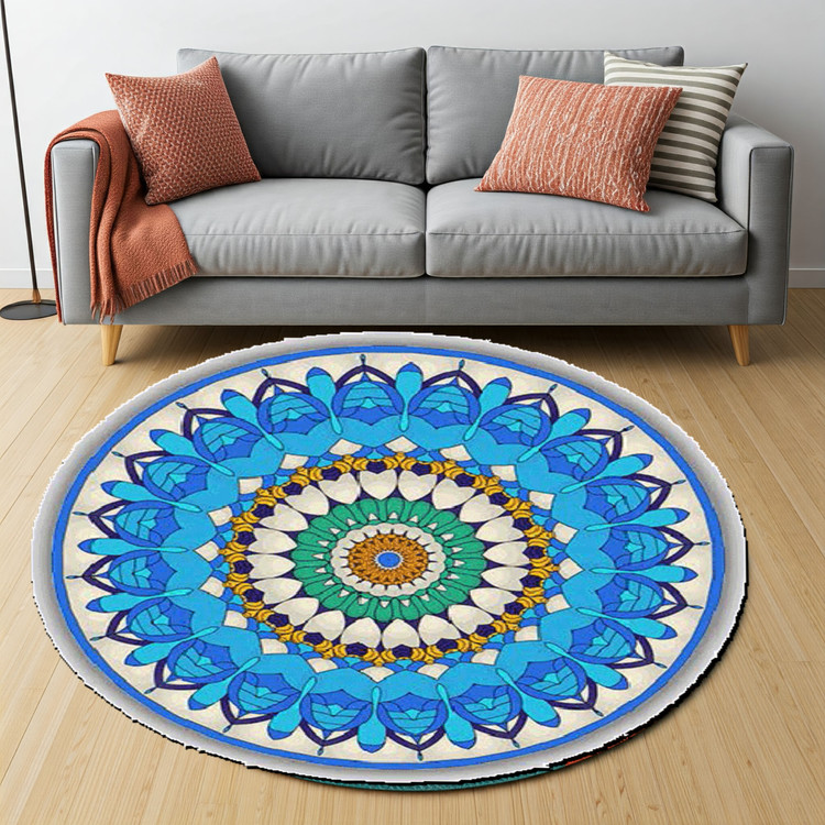 فرش دایرهای فیروزهچرخان کد D134 با رنگهای فیروزهای و آبی و طراحی چرخشی، فضایی پویاتر و زیباتر به خانه شما میبخشد و مناسب دکوراسیونهای مدرن و هنری است.