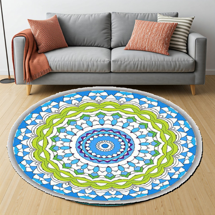 فرش دایرهای آبینگار کد D141 با رنگهای سبز و آبی و طراحیهای هندسی، فضایی مدرن و آرامشبخش به خانه شما میبخشد و مناسب دکوراسیونهای مینیمال است.