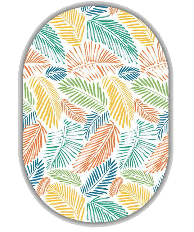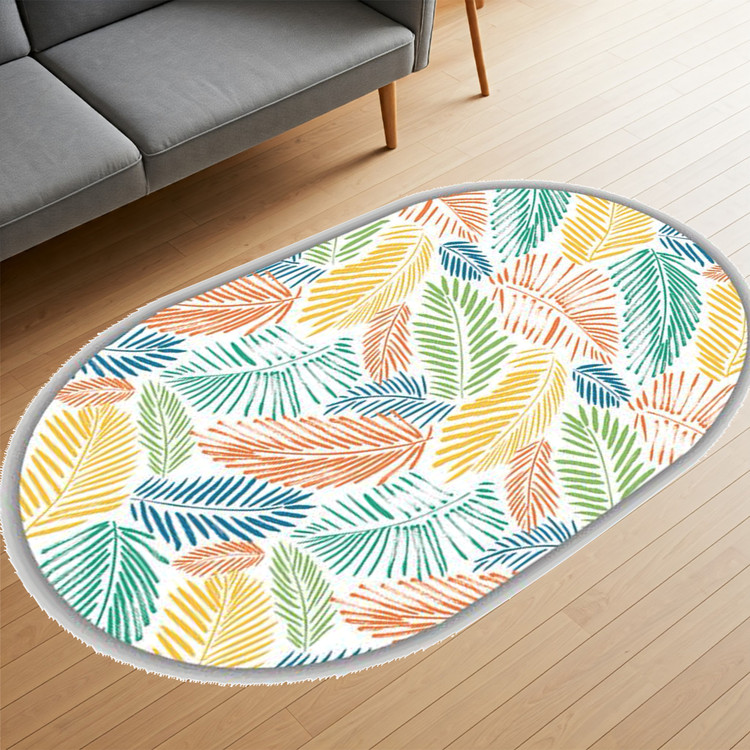 فرش بیضی برگهای استوایی کد B136 با طرحهای برگهای رنگارنگ و شاد، برای دکوراسیونهای مدرن و پویا مناسب است.