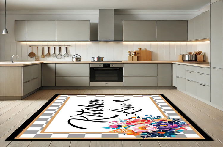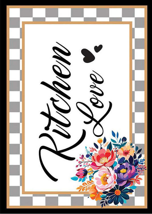 فرش گلهای عشق کد K200 با ترکیب زیبای گلها و نوشته "Kitchen Love"، محیط آشپزخانه را به فضایی پر از طراوت و عشق تبدیل میکند.