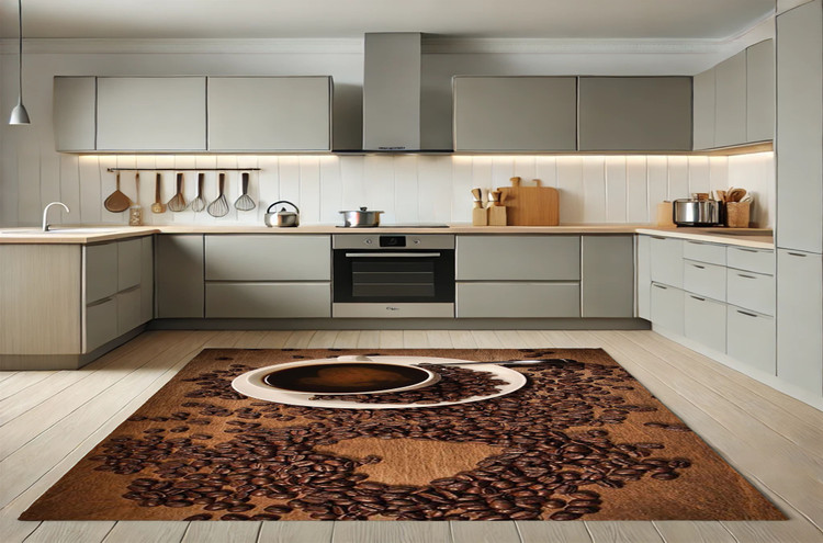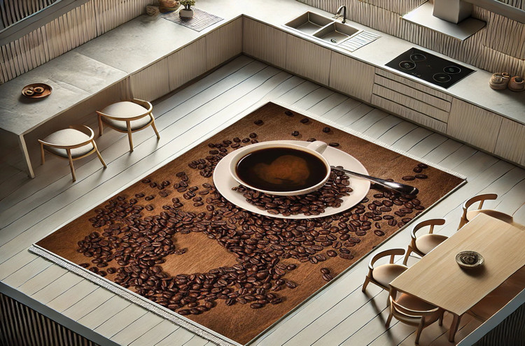 فرش نقشه قهوهای کد K203 با طرحی از دانههای قهوه که به شکل نقشه جهان تشکیل شده است، به آشپزخانه شما استایلی مدرن و منحصربهفرد میدهد.